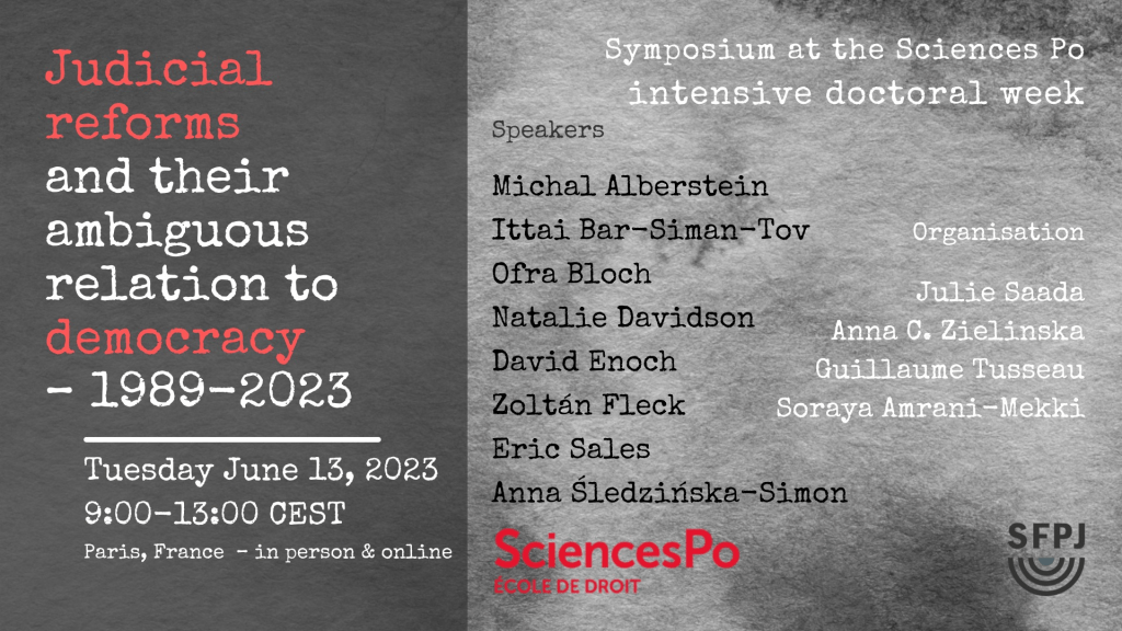 - Co-organisation of a symposium (with Julie Saada, Guillaume Tusseau & Soraya Amrani-Mekki) : Judicial reforms and their ambiguous relation to democracy – 1989-2023, Intensive Doctoral Week at Sciences Po Paris / Semaine doctorale intensive Sciences Po – SDI / événement SFPJ (Société française pour la philosophie et la théorie juridiques et politiques), June 13, 2023, Paris (9:00-13:00, in person & online) – recording.