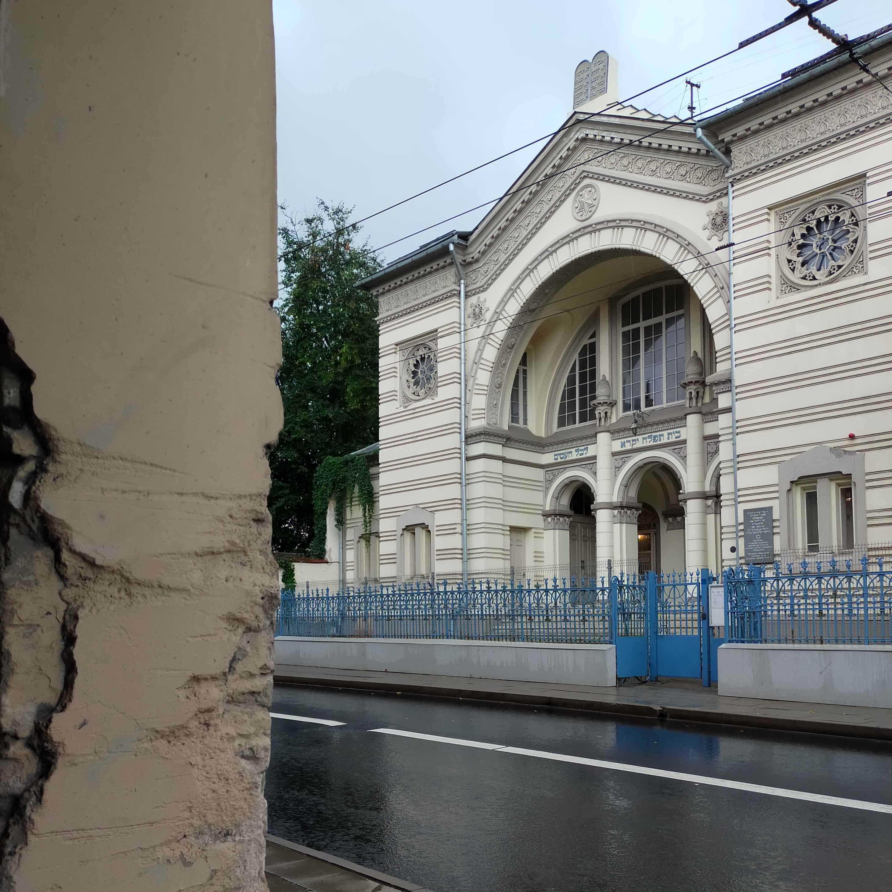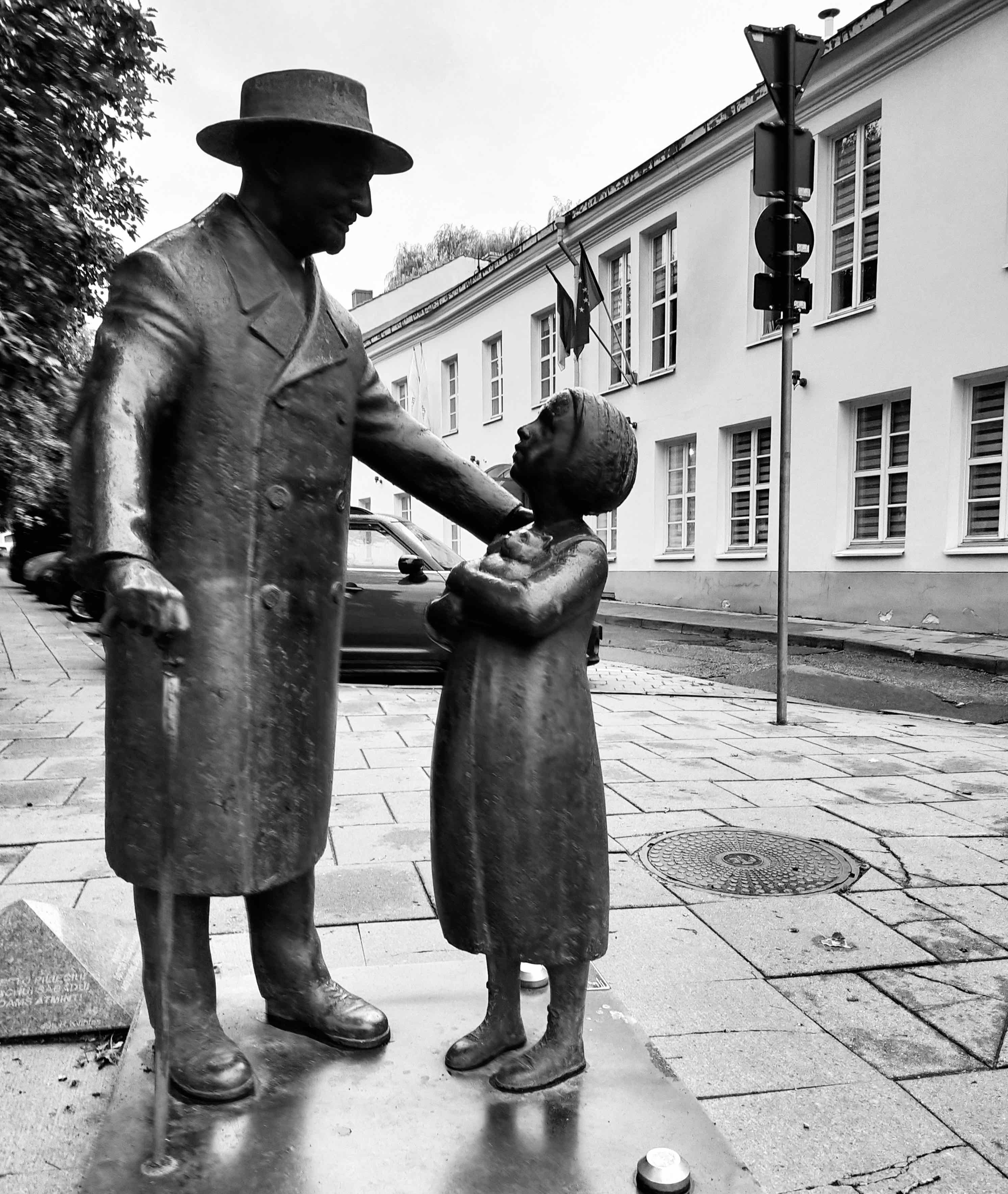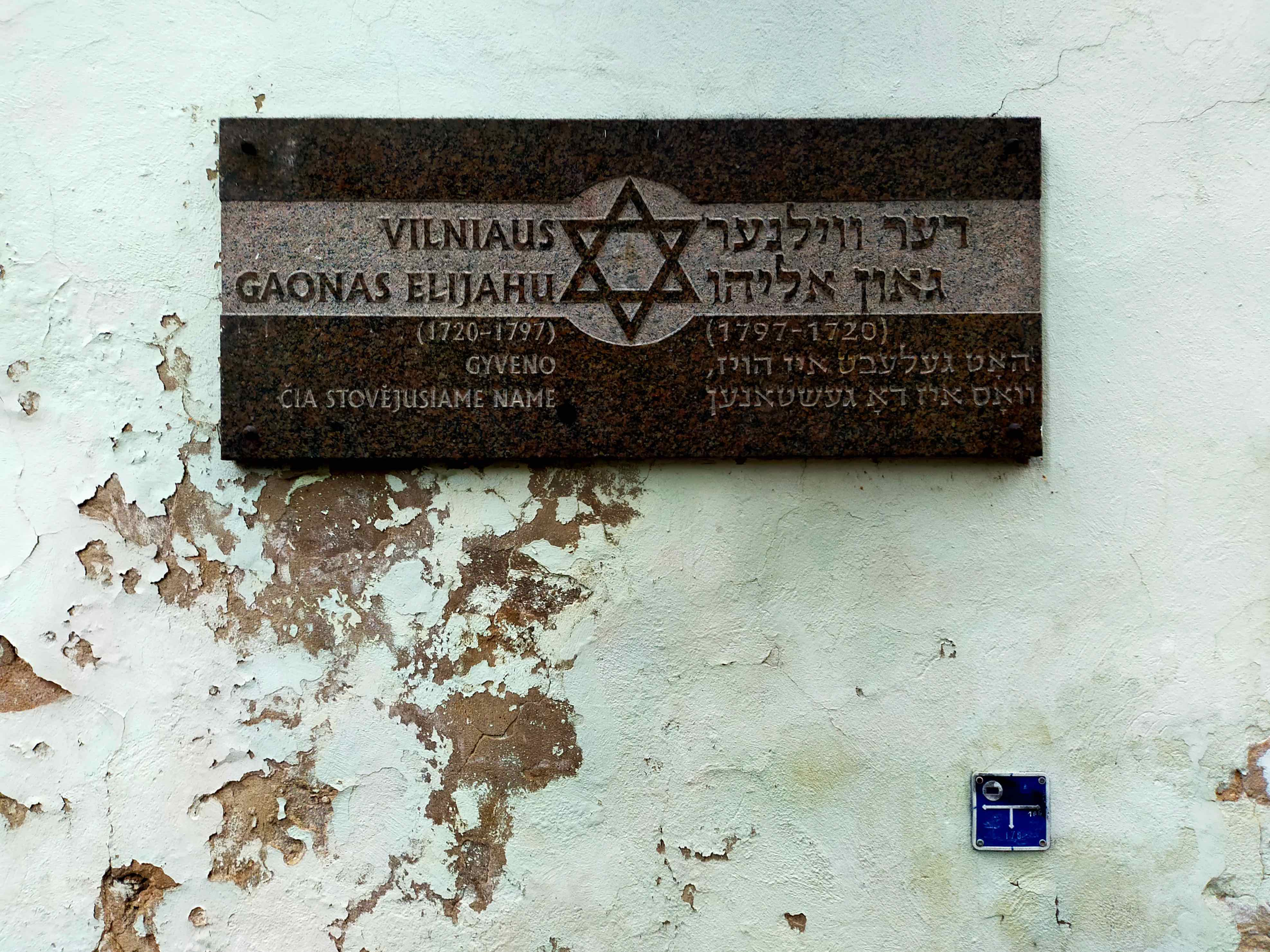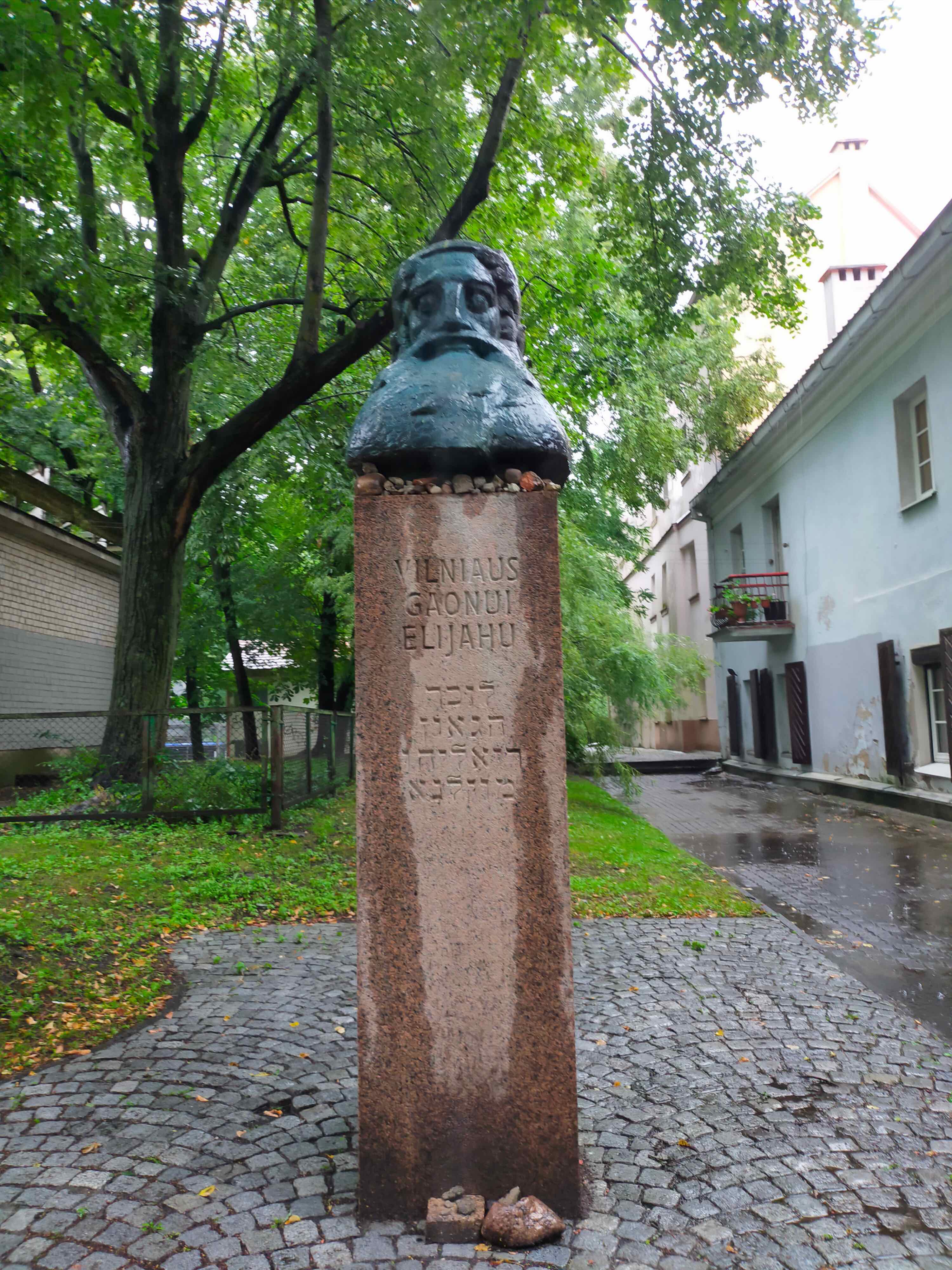 Jerusalem of the North. Jewish street, with a statue of Elijah ben Solomon Zalman (ר’ אליהו בן שלמה זלמן), Vilna Gaon (Yiddish: דער װילנער גאון Der Vilner Gaon, Polish: Gaon z Wilna, Lithuanian: Vilniaus Gaonas), a Lithuanian Talmudist (1720 – 1797), halakhist, kabbalist, and leader of misnagdic (non-hasidic) Jewry. And the only currently functioning synagogue, one of the two in Lithuania (the second being in Kaunas), as well as a sculpture of Zemach Shabad, doctor and politician and a few graffitis of missing ordinary inhabitants of the city.